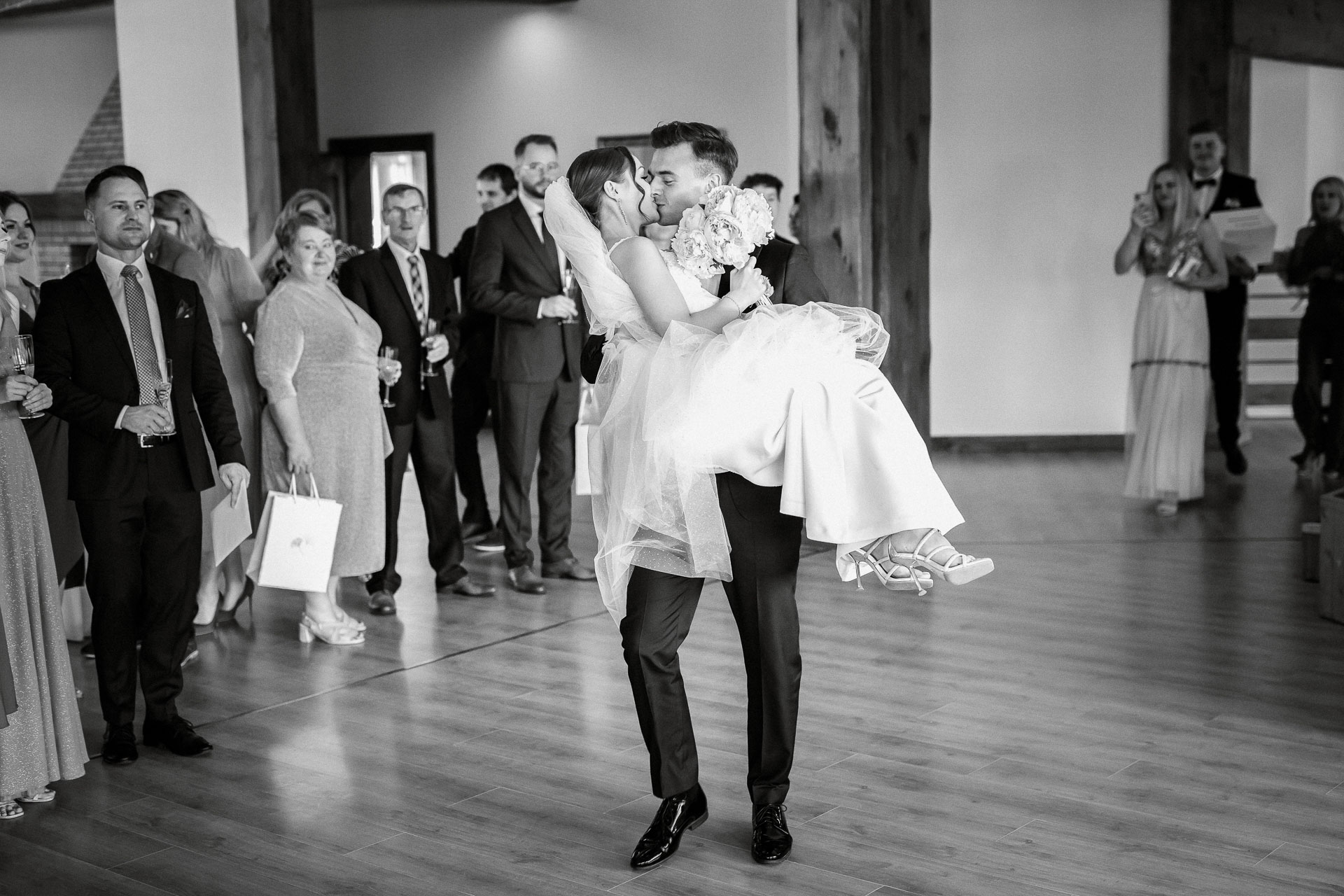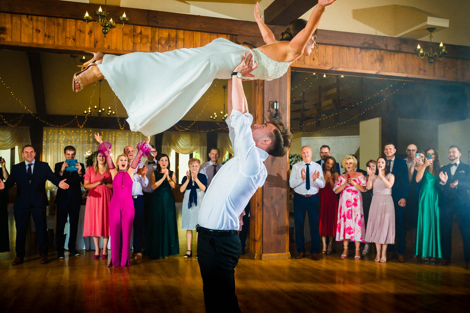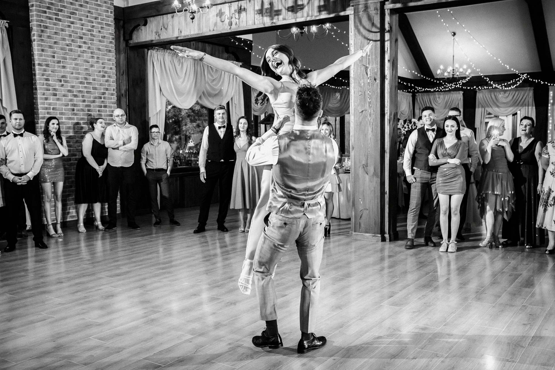 Wesele na sali w Ostrówce to był już sztos! Kacper jest wybitnym tancerzem. Widzieliście kiedyś na żywo pokazowy taniec z kultowego Dirty Dancing? No a ja tak 🙂 Z Wiktorią dali taki popis, że szczękę zbierałem z między potłuczonych wcześniej kieliszków.