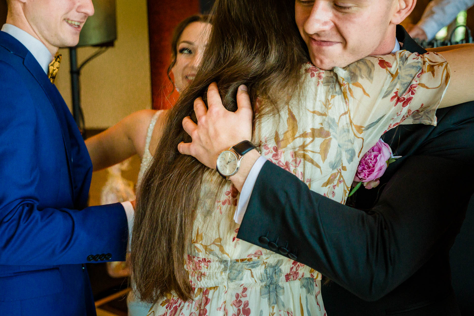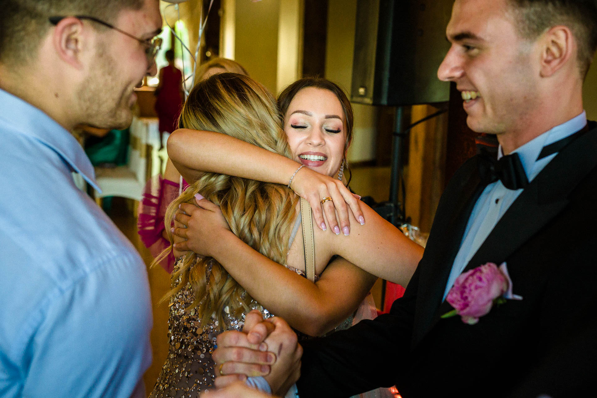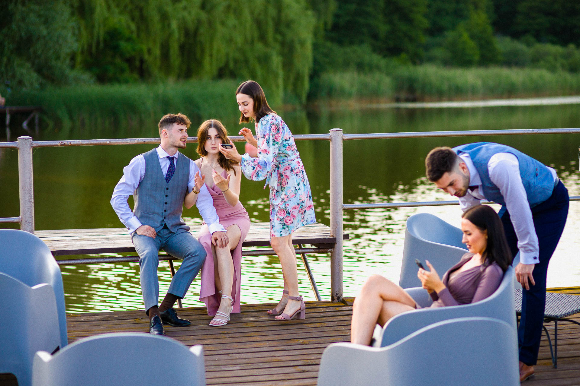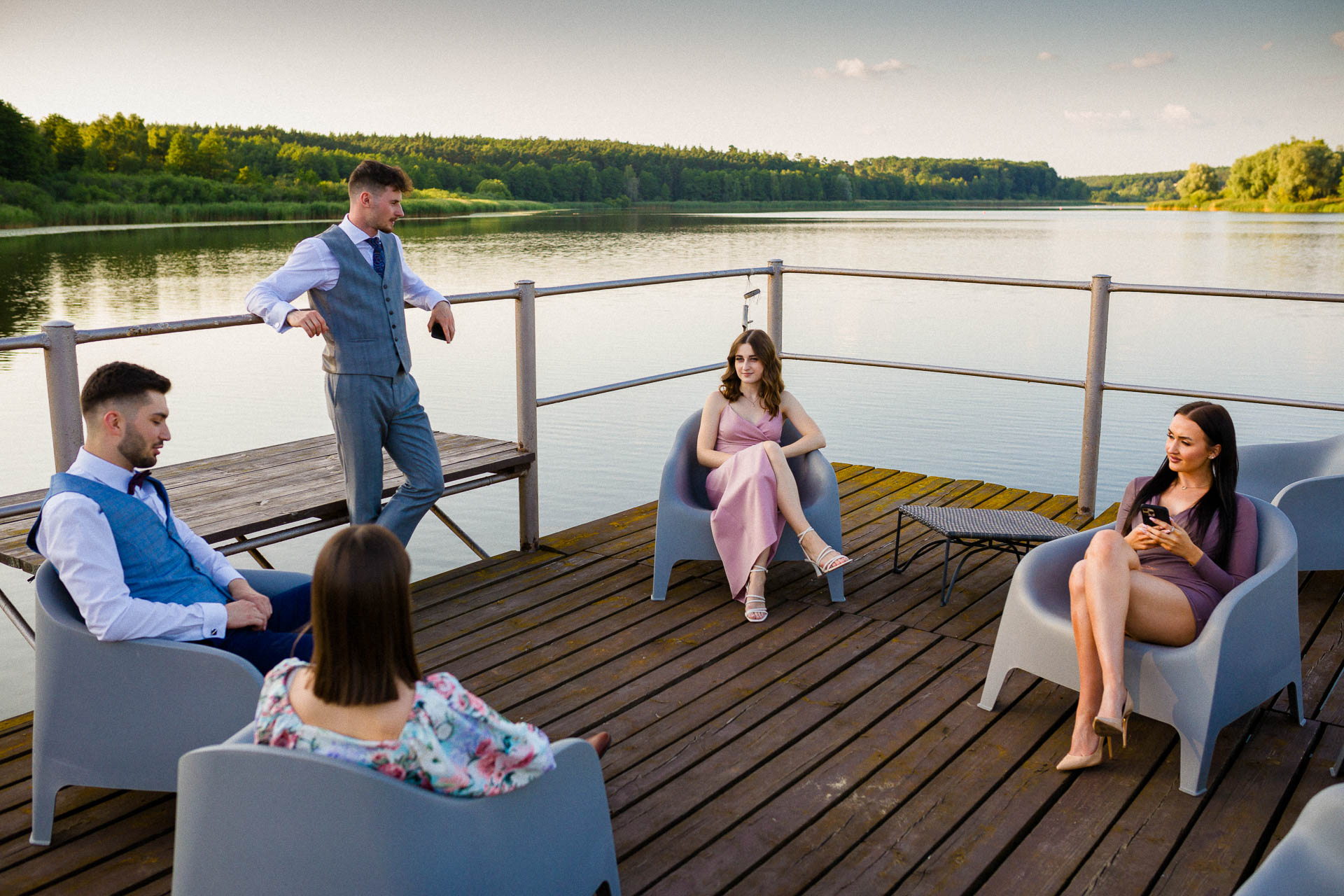 Wesela latem mają to do siebie, że goście do zachodu słońca dużo czasu spędzają na zewnątrz. No i ja się nie dziwię. Piękne niebo, ciepło, dużo śmiechu. Zespoły nie lubią, gdy jest pusty parkiet. A dla mnie to wymarzona sytuacja do reportażowych zdjęć gości, którzy dobrze się bawią w swoim towarzystwie.